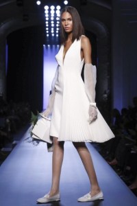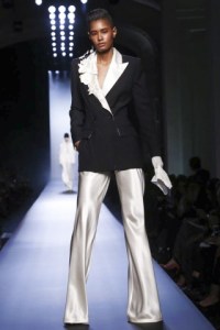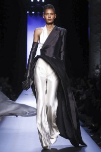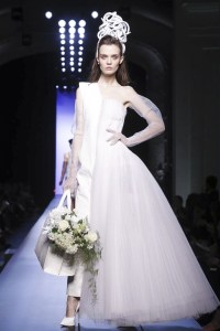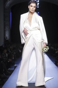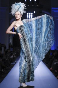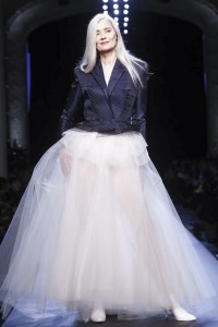 Stunning art forms with intricate details from top to bottom with huge ball gowns, Anna Cleveland debuted the final wedding gown and it certainly deserved around of applause. Gaultier and Cleveland danced down the runway hand and hand to the song „In The Navy“ by Village People.