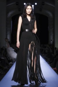 The Celtic Circle defined many of the silhouettes – appearing as giant circle skirts often embroidered in traditional patterns – and one gold show-stopper with black feather fringing.