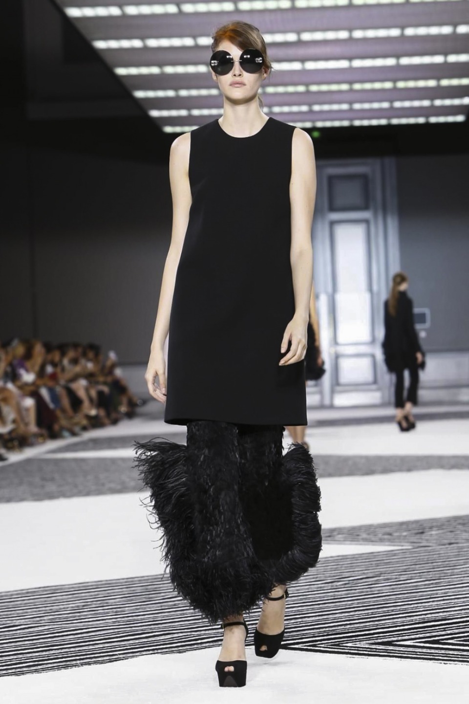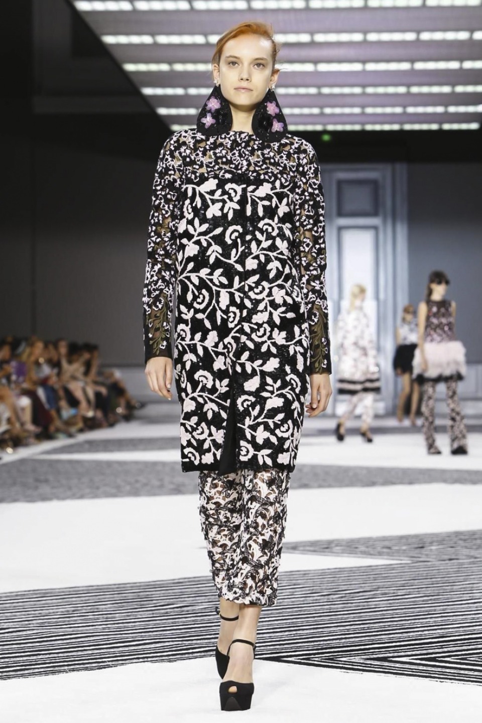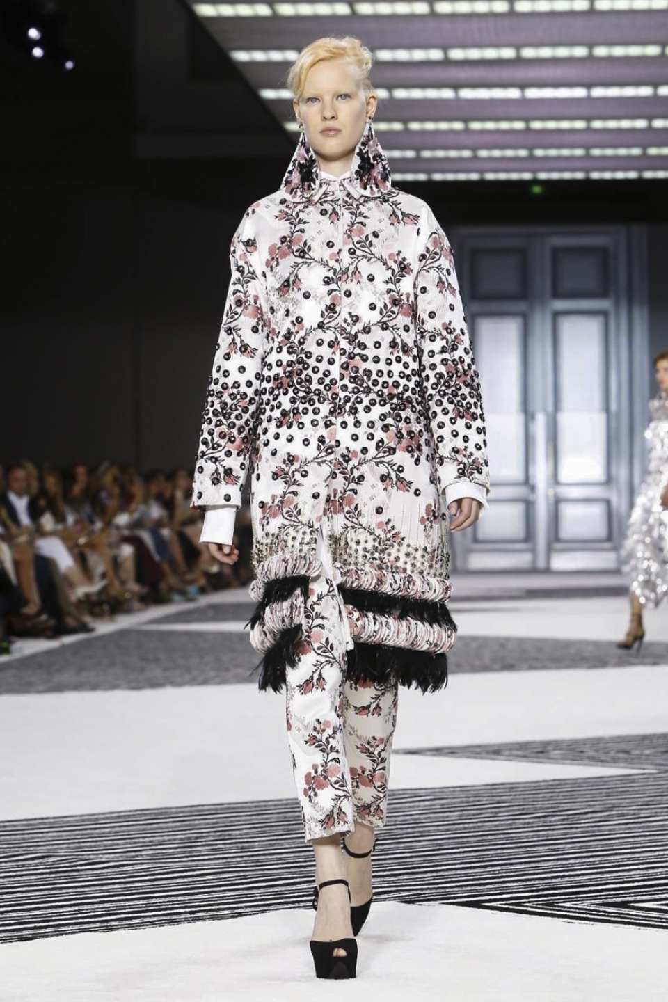 The pure lines of his designs, with a vaguely Sixties flavor to them, gave plenty of space – and fabric – to elaborate surface adornments. Although the flower motif, that habitual Valli signature, was everywhere, his blooms this season were not always of the natural variety. Glass flowers and raised embroideries of vines crawled up available surfaces. Crisp looking petals stuck out. Even the printed lilies-of-the-valley were artistically digitized. Likewise the color palette – you could see where the lilac and orange had come from. Black and white threw yellow and green in stark contrast. It was the future of flora, seen through the crystal-adorned round lenses of retro-modernity. For all the twinkling, sparkling, shimmering (all those giant silver rhodoids, beads and crystals, marabout trims), it was as slick as a glossy picture, more ritzy than romantic.