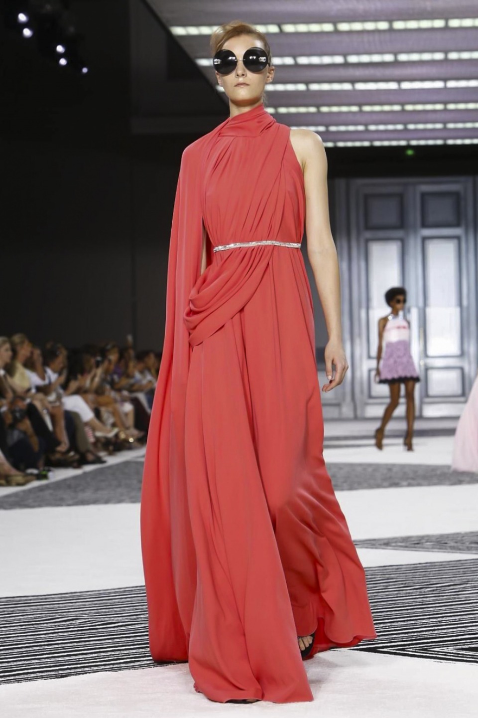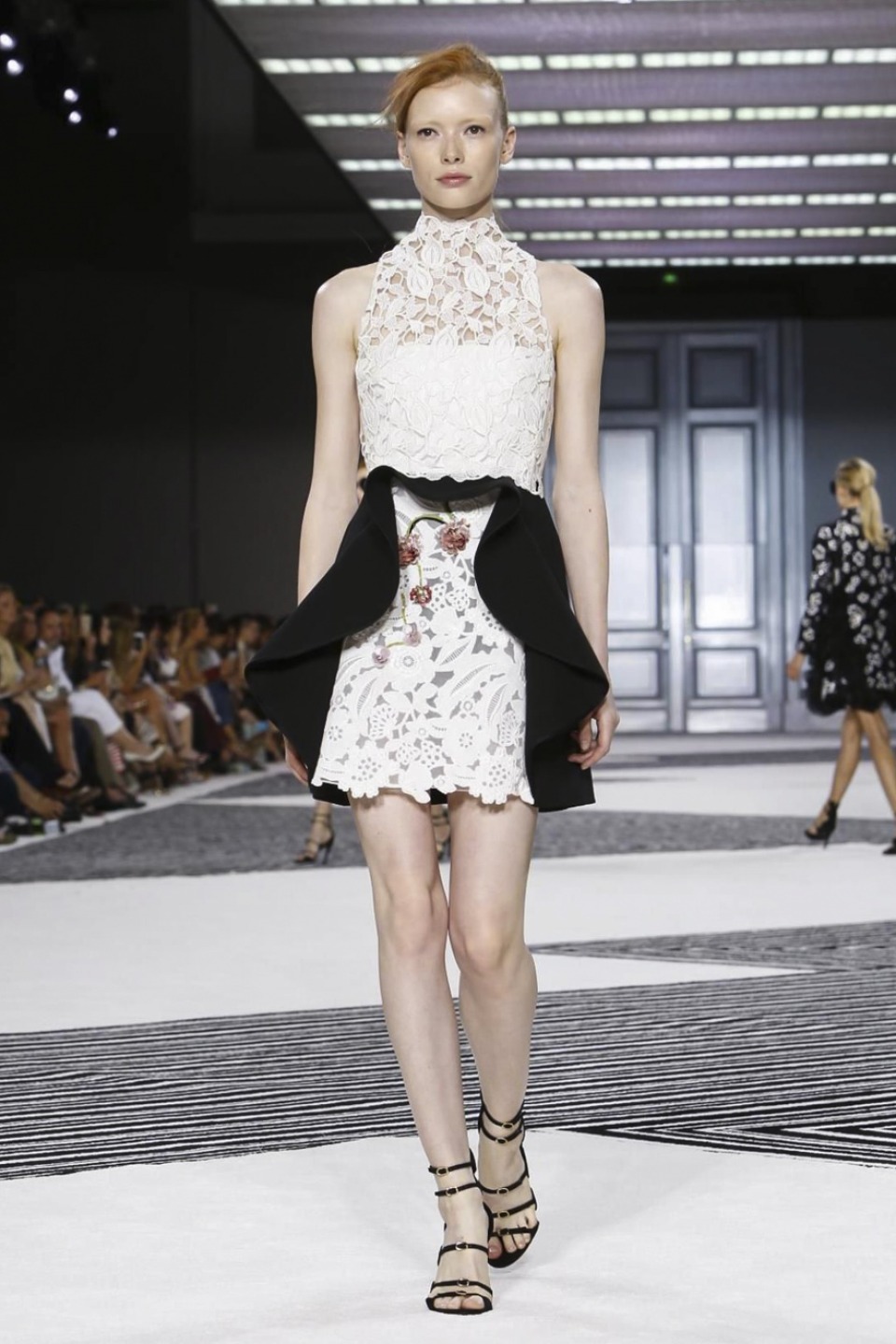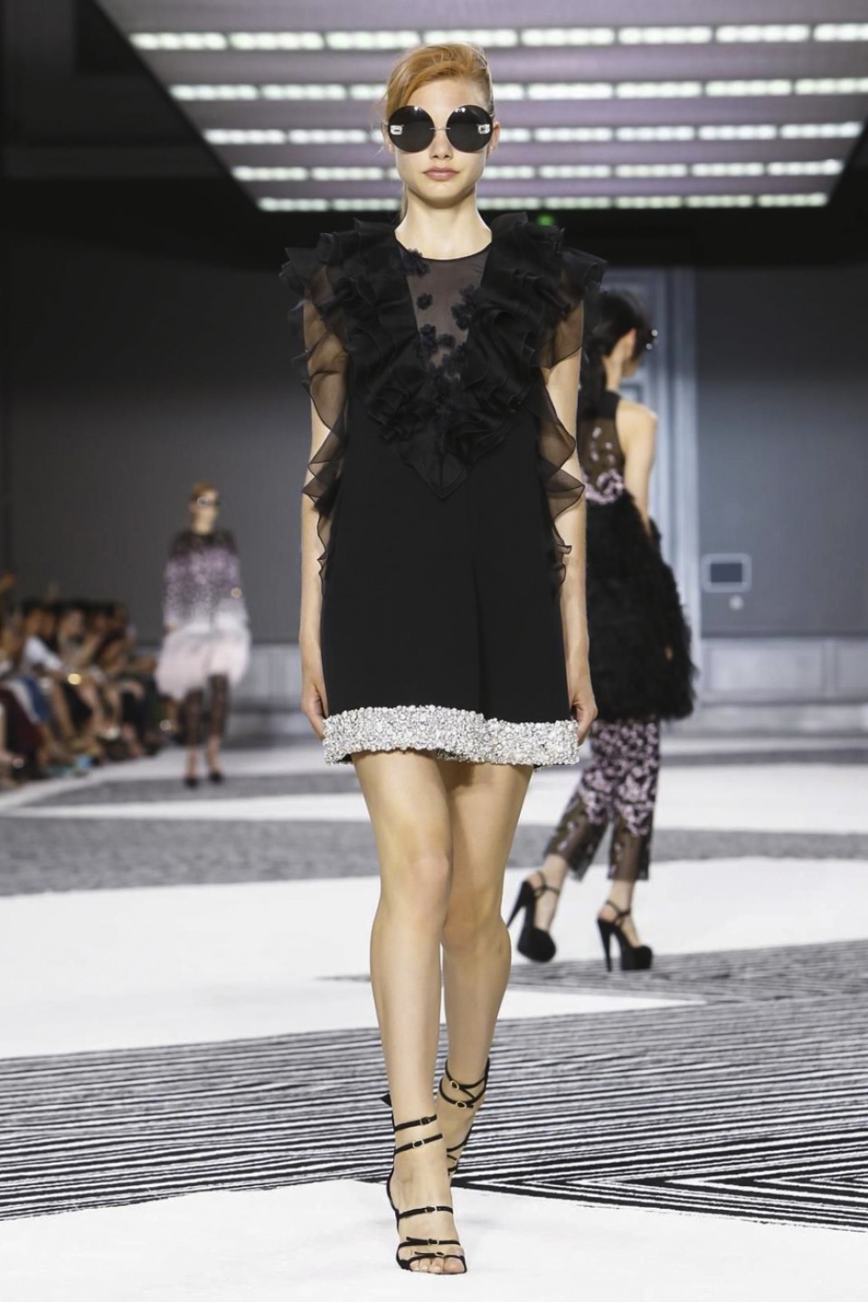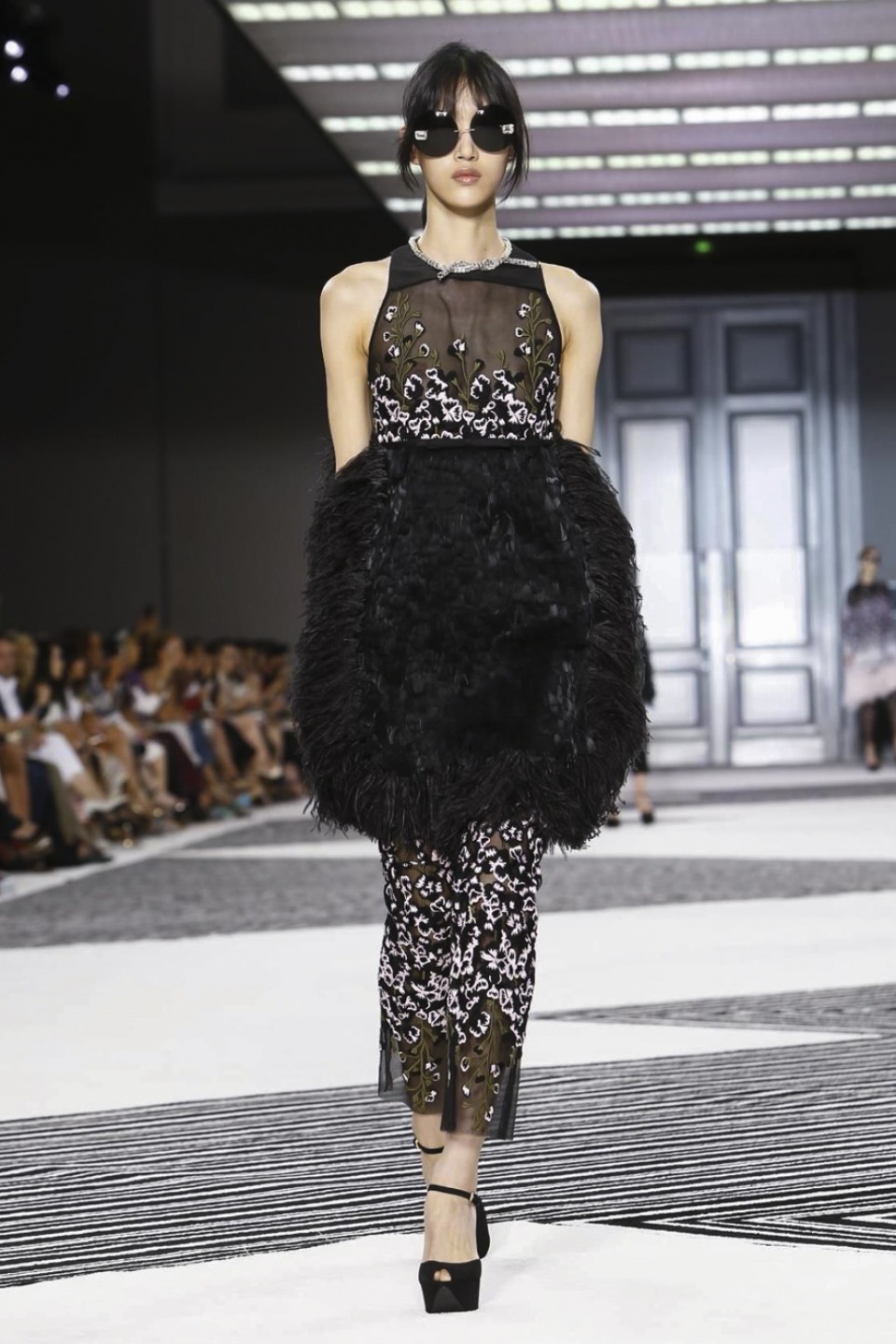 The pure lines of his designs, with a vaguely Sixties flavor to them, gave plenty of space – and fabric – to elaborate surface adornments. Although the flower motif, that habitual Valli signature, was everywhere, his blooms this season were not always of the natural variety. Glass flowers and raised embroideries of vines crawled up available surfaces. Crisp looking petals stuck out. Even the printed lilies-of-the-valley were artistically digitized. Likewise the color palette – you could see where the lilac and orange had come from. Black and white threw yellow and green in stark contrast. It was the future of flora, seen through the crystal-adorned round lenses of retro-modernity. For all the twinkling, sparkling, shimmering (all those giant silver rhodoids, beads and crystals, marabout trims), it was as slick as a glossy picture, more ritzy than romantic.