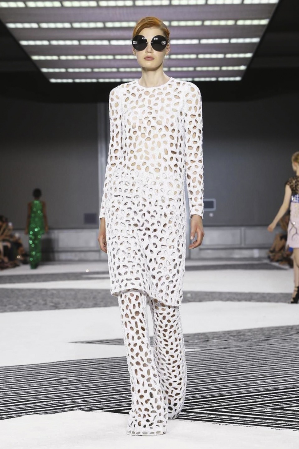 Clinical neons above the runway gave the black-and-white triangles of striped carpeting a very dizzying Op Art glare. The opening looks were like ruffled spores, sculpted hemispheres clinging to hems or to the backs of models. Soon enough, they blossomed out into the breadth of his glamorous silhouettes. Lean pairings of long tunics over slightly flared pants kept things more Slim Aarons than Flower Power, proposing a more grown-up notion. Short shifts had a bit of kick to them, showing enough leg to satisfy the younger Valli girls. Not that it would matter, but there were even embellished „t-shirts“ hiding under honeycomb embroideries and other ruffles.