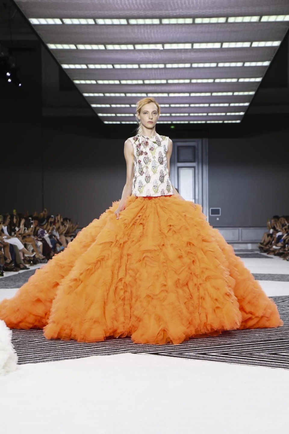 By the time the show came to its ball gowns, the closing group, their lengthy flurries of tulle ruffles trailing behind them, looked almost blowsy from their effort of being in full bloom, an effort as intensive as the energy required to drag that much tulle down the carpeted runway. Perhaps the length of the runway diluted their effervescence somewhat, but from the applause, there was still plenty of fizz to go around.